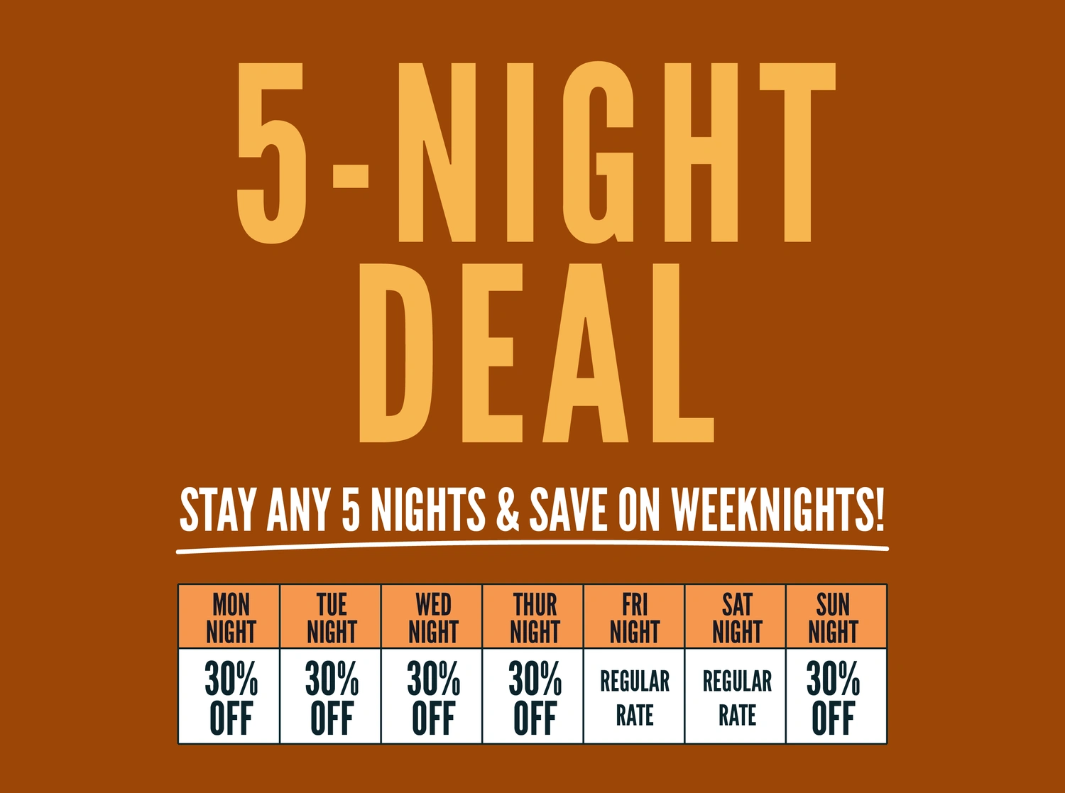 Stay 5 weeknights any time this season with 30% off cabins and campsites!