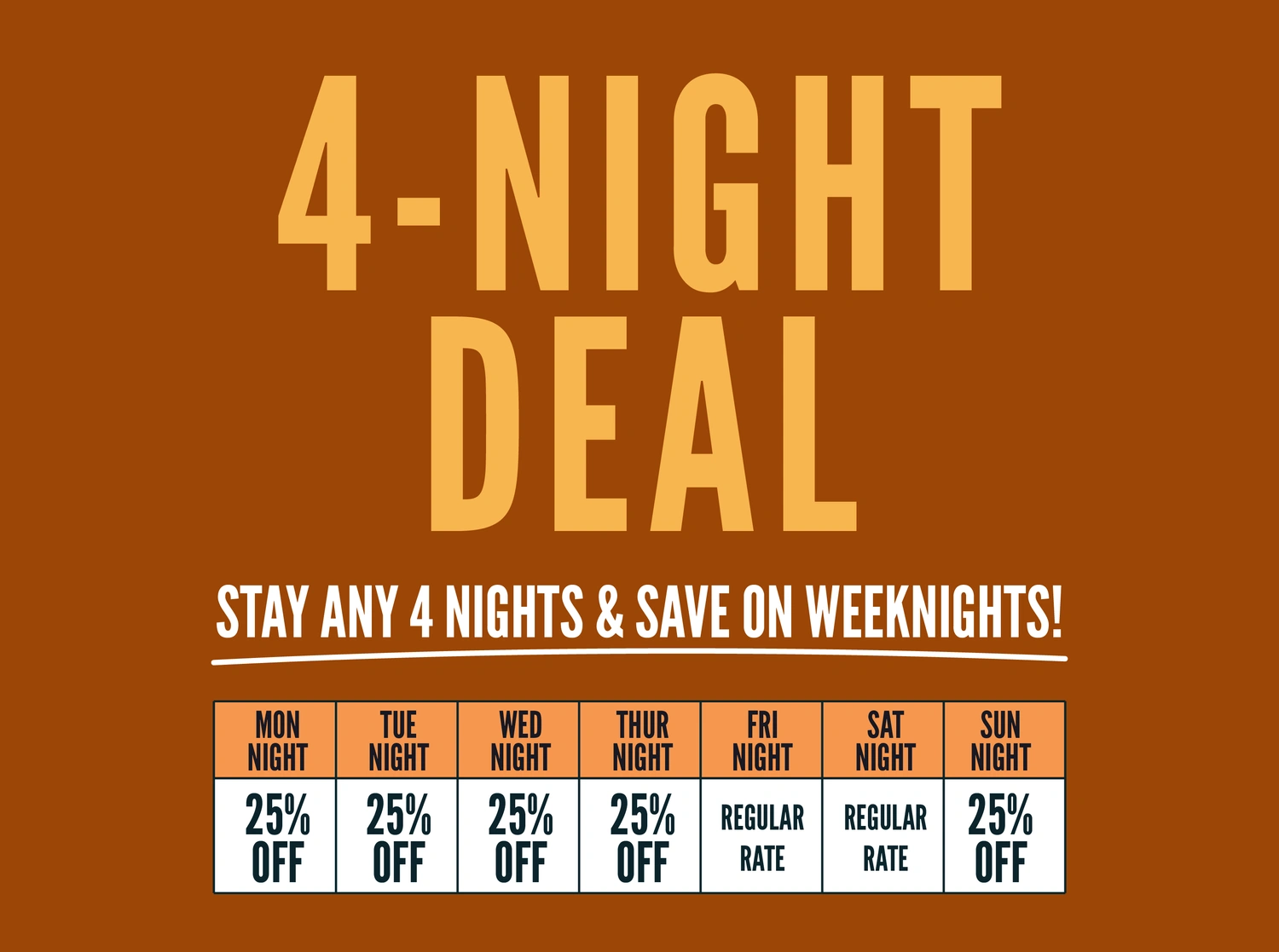 *Check in any day, Sunday-Friday. Not valid for Saturday arrivals or departures. Offer has limited availability. Excludes Group Lodges. Price matching based on future discounts is not allowed. *Deal code may be applied to qualifiable bookings at any time prior to arrival. If applied 48 hours after booking creation, any resulting credit will be made available as a Camp Credit to be applied within 1 year of application towards a future booking at Monument RV Park only.