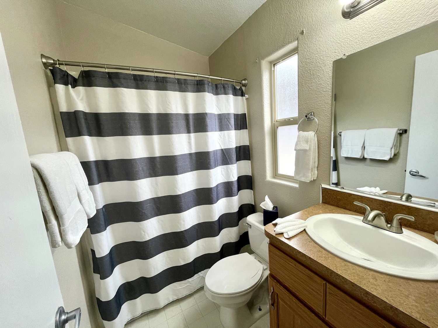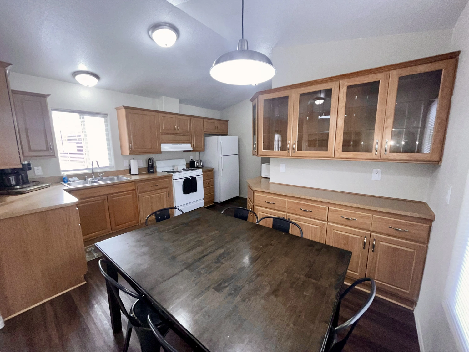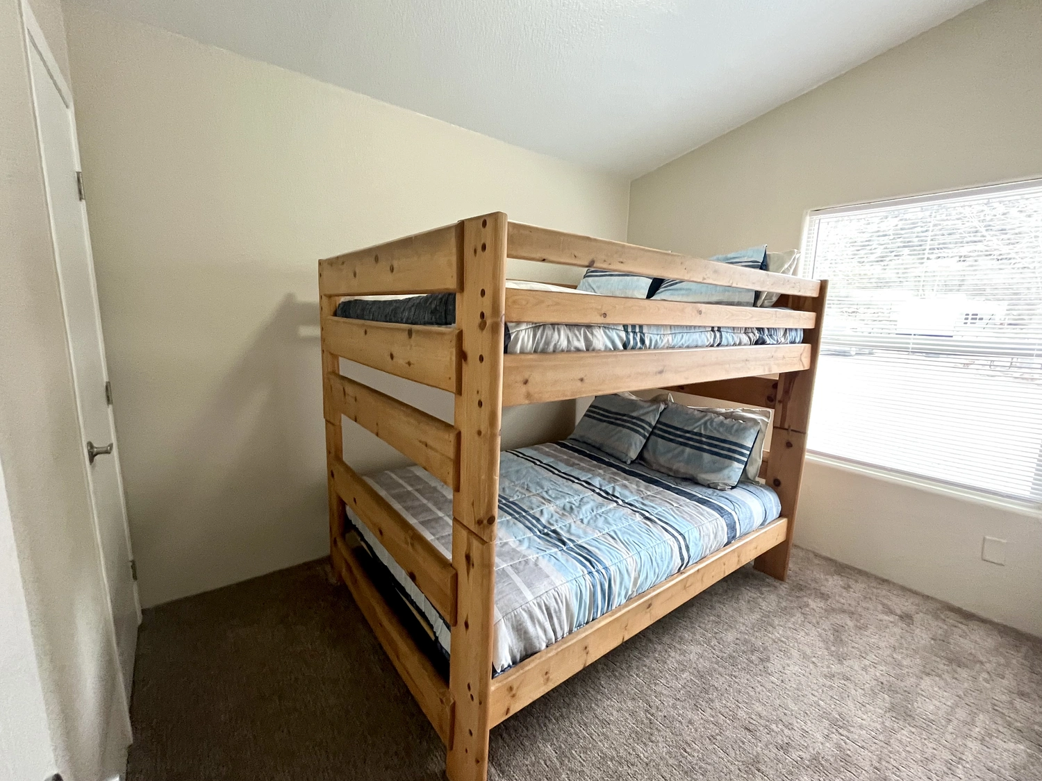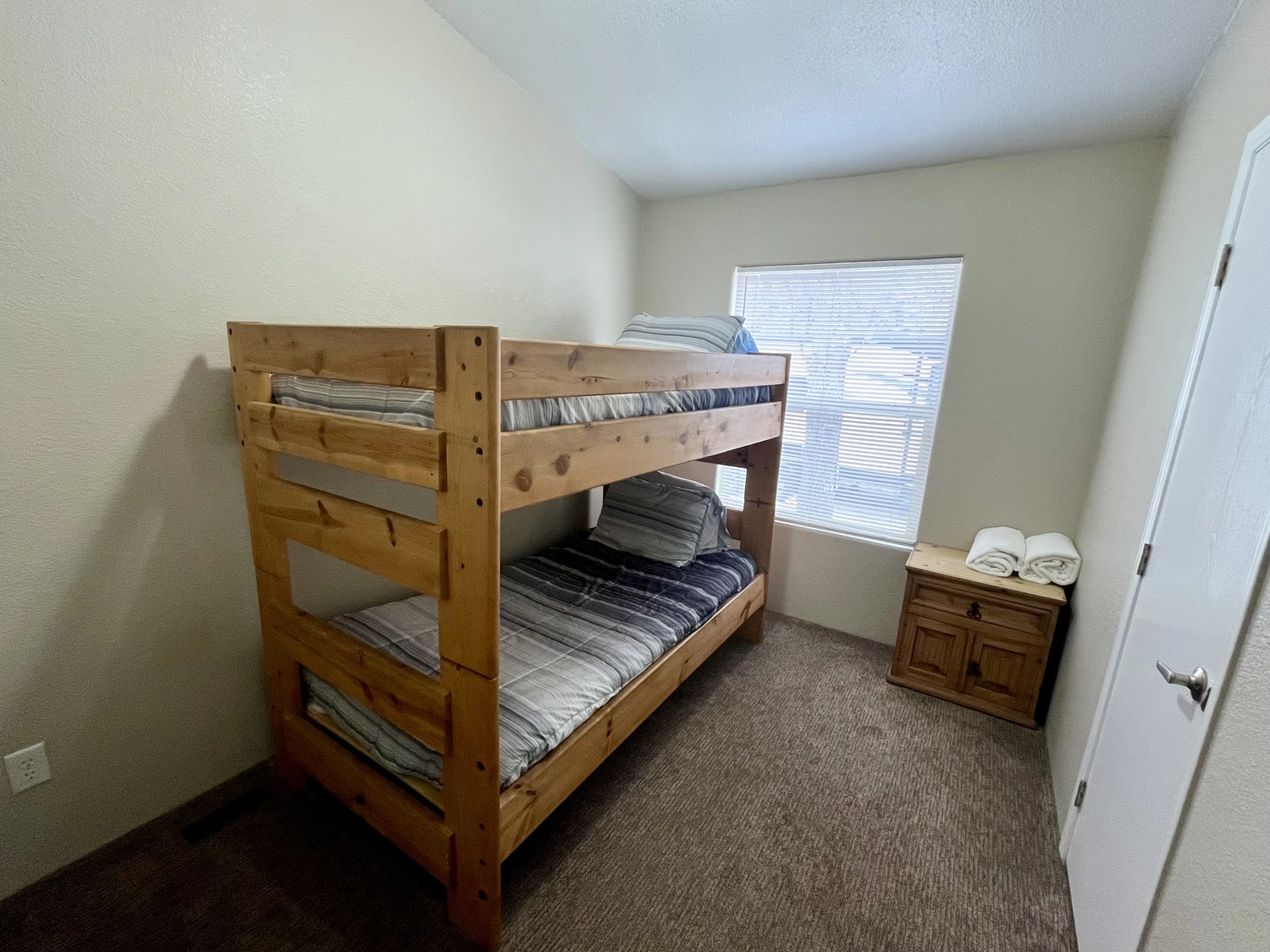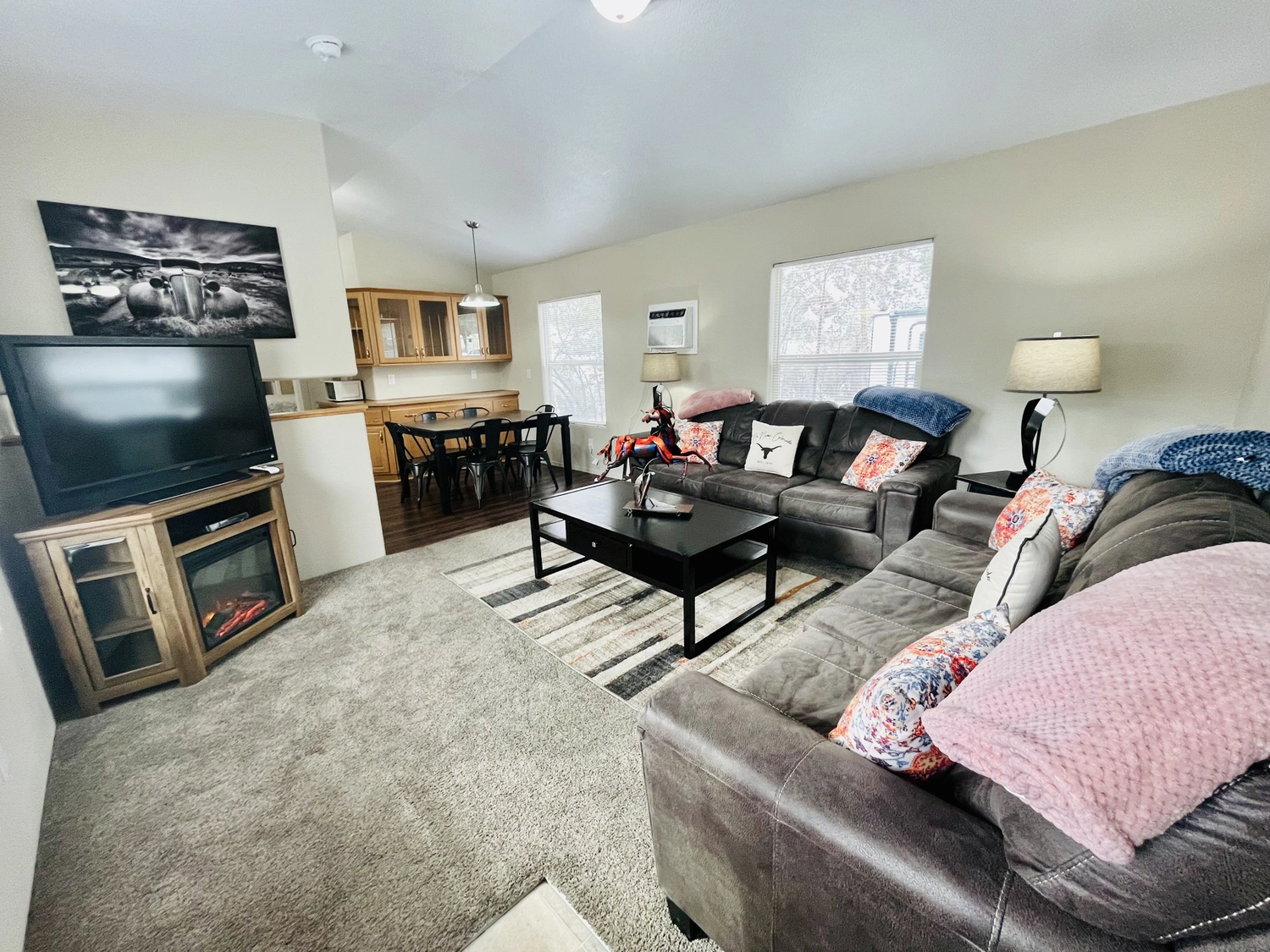 Looking for extra space to accommodate your larger group? Our spacious Family Lodges sleep up to 8 and are the ideal choice! Centrally located, these two cabins overlook a large common area with a communal picnic table, creating the perfect gathering spot for families or groups. Each cabin features a master en-suite with a king-size bed, a second bedroom with double bunk beds, a third bedroom with twin bunk beds, two full bathrooms, a fully equipped kitchen, a dining room, and a cozy living room with a 42″ flat-screen TV. Enjoy Wi-Fi, air-conditioning, cable, electricity, and heat in our Family Lodges. Rates include 4 occupants (age 4+). Fees apply for additional persons.
