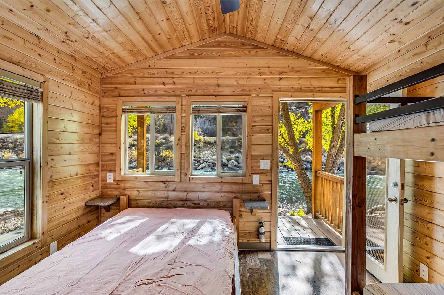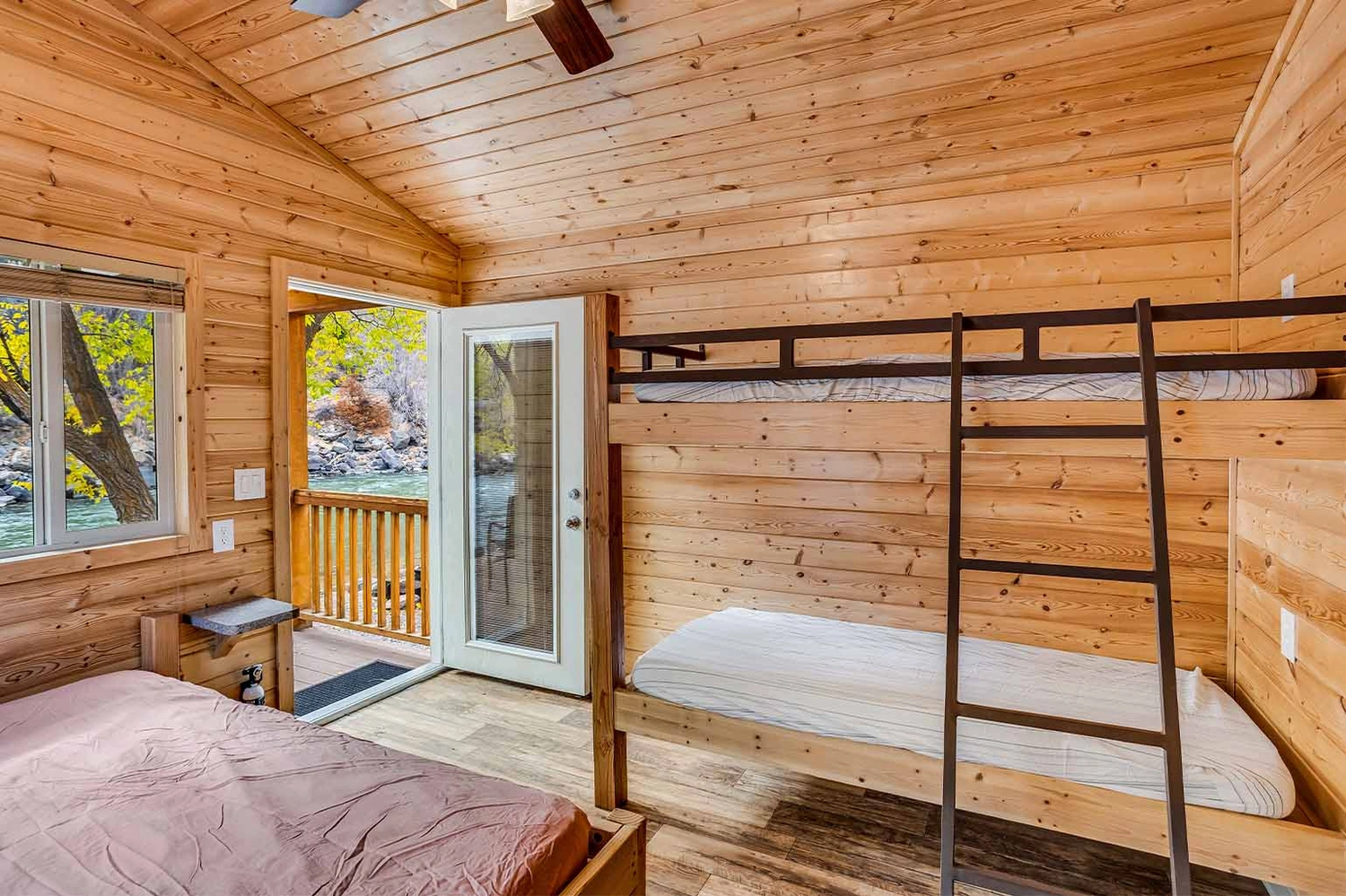 Nestled just feet from the Colorado River, this charming Riverfront Rustic Cabin offers a cozy and secure camping experience. The log cabin features a double bed, twin bunk beds, A/C, heat, a covered porch with lounge chairs, a picnic table, and a private campfire pit. Just steps to the bathhouse, it’s the perfect getaway for up to 4 guests. Rates include 4 occupants (age 4+). Fees apply for additional persons.