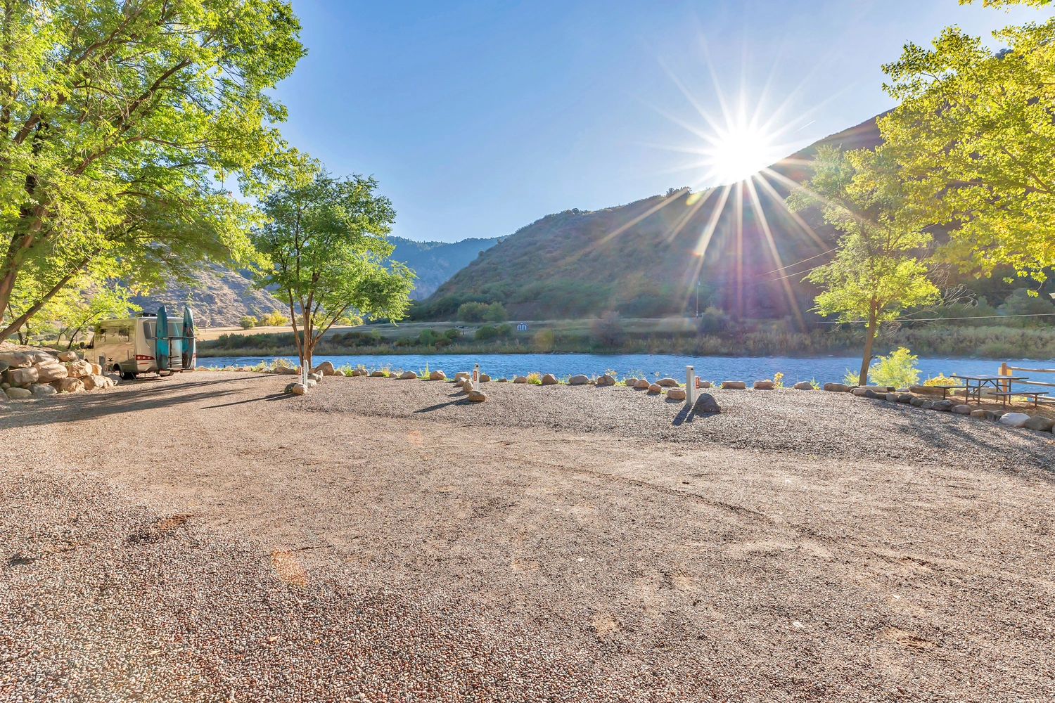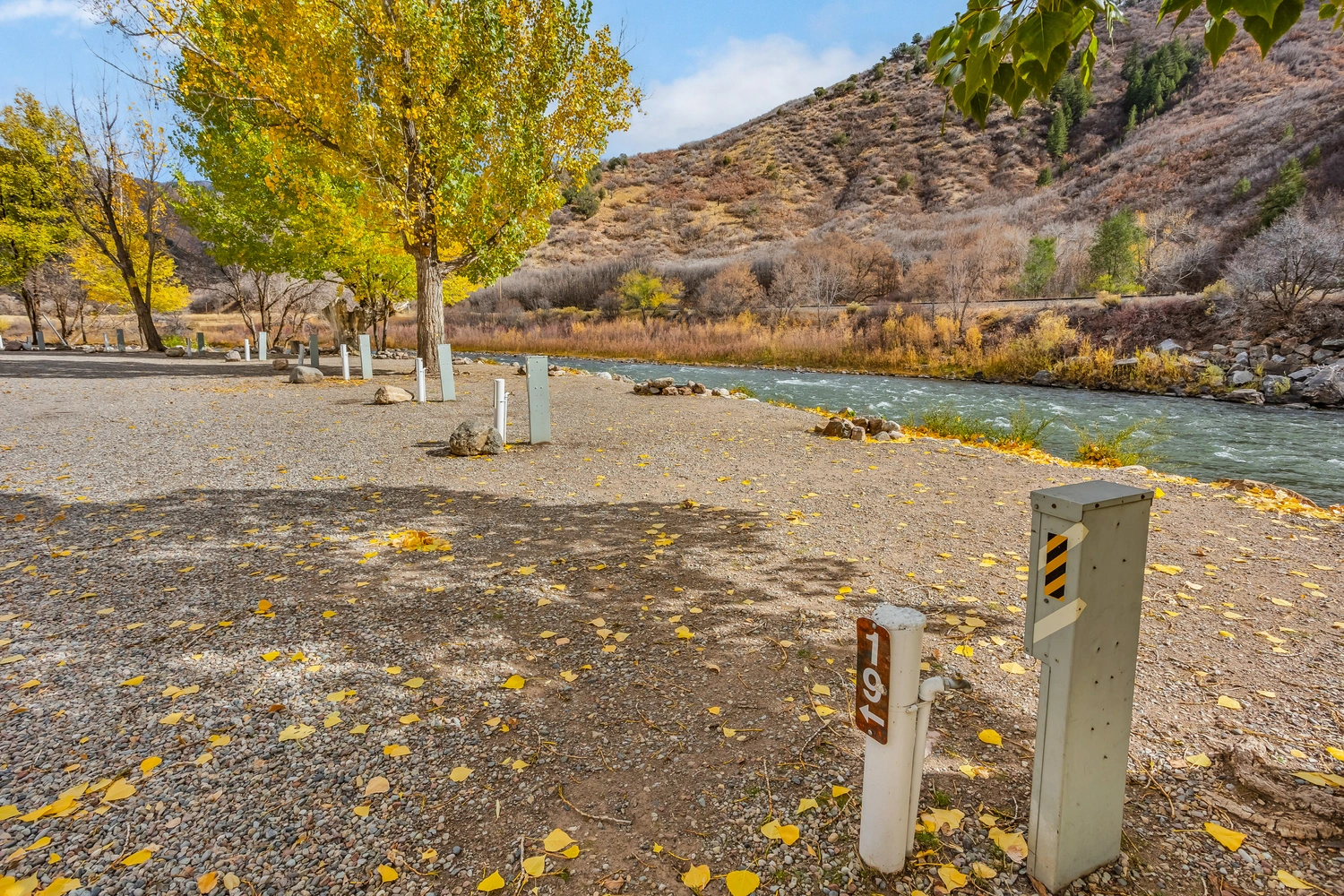 This picturesque Riverfront Standard RV Site is ideal for small RVs, vans, pop-ups, and truck campers up to 30′ in length. Located in the stunning Glenwood Canyon, the site features water and electric hookups, convenient access to a nearby bathhouse, and a dump station available for use. Rates include 4 occupants (age 4+). Fees apply for additional persons. Sites #005-019 and #053-054 include a personal fire pit.